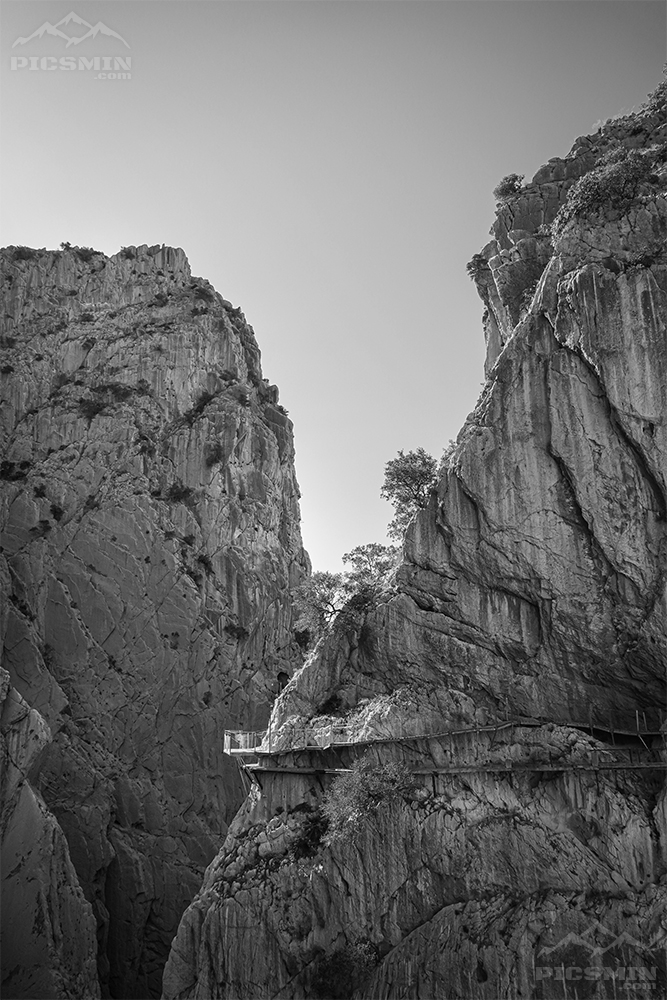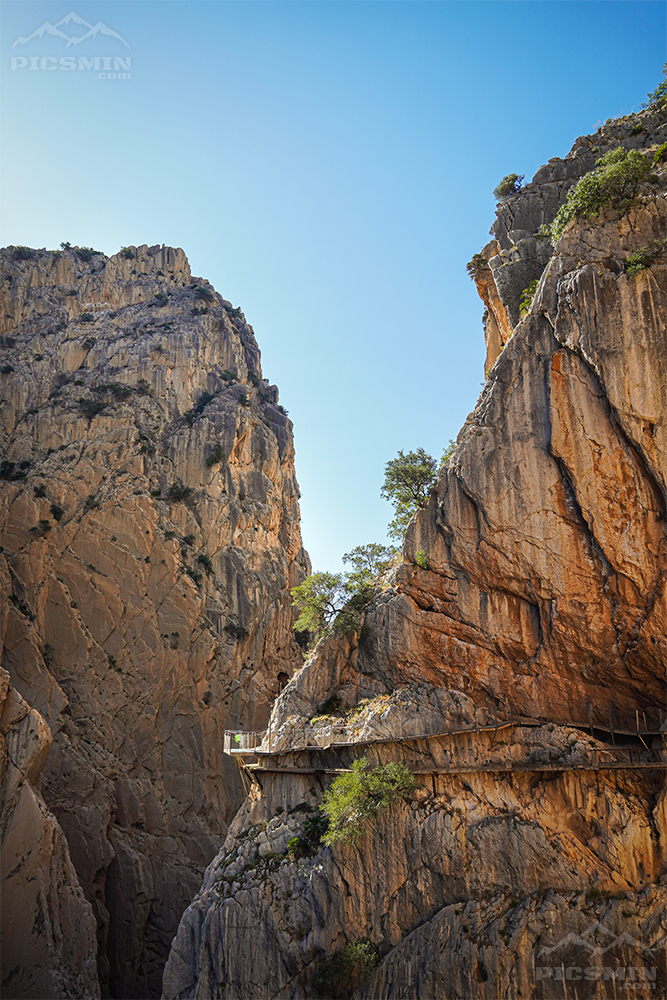 The breathtaking final stretch of Caminito del Rey comes into view, with towering rock walls on either side framing the narrow, suspended path along the cliff edge. The sky is a perfect, cloudless light blue, making the rugged beauty of the rocks and the daring walkway stand out even more. The path seems to float above the gorge, creating a thrilling mix of awe and adventure as it winds through the dramatic landscape. It’s a stunning scene that captures both the power of nature and the human spirit of exploration.