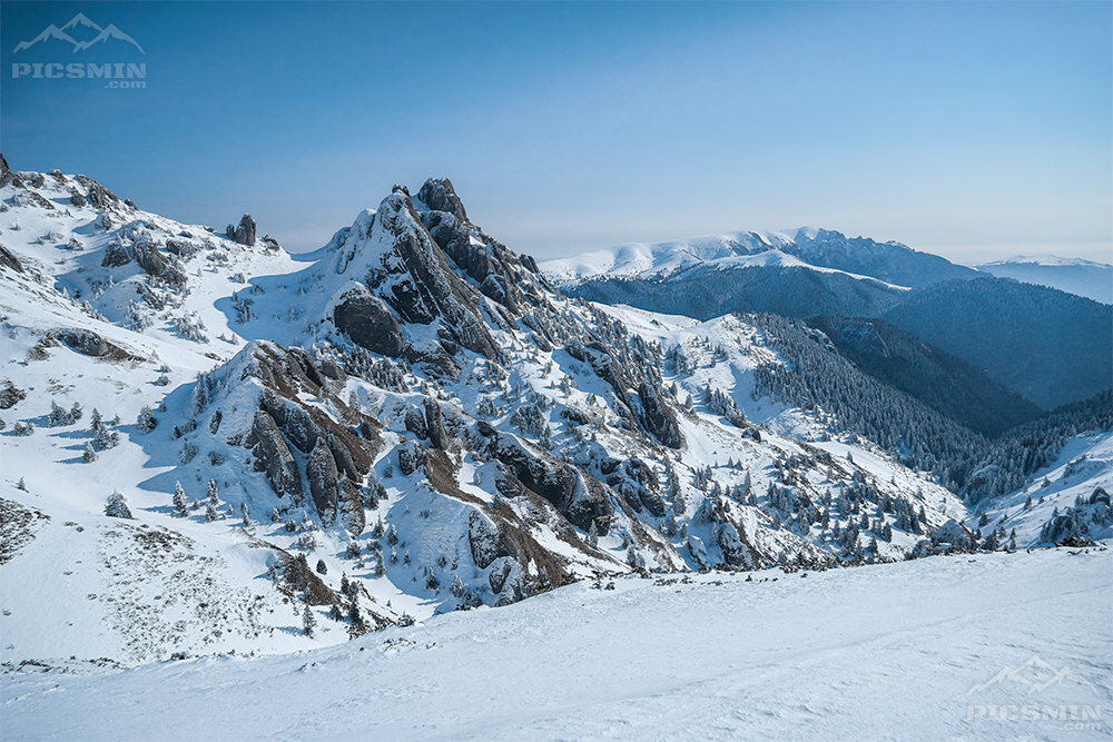 The snow-covered peaks rise sharp and proud, carving into the clear blue sky. Every ridge and slope is blanketed in white, creating a breathtaking mix of rugged edges and smooth drifts. In the distance, the mountain range stretches endlessly, fading softly into the horizon. It’s the kind of winter scene that feels untouched and pure, a quiet reminder of nature’s raw, unfiltered beauty.