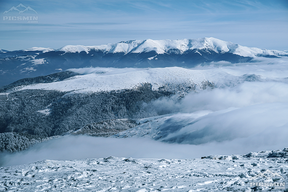 A breathtaking capture of snow-covered mountains, where rolling clouds weave through the rugged peaks. The contrast between the dark forests and the white snow creates a dramatic and timeless scene, evoking the raw beauty and power of nature. This high-altitude perspective invites the viewer to experience the grandeur of the mountains in its purest form.