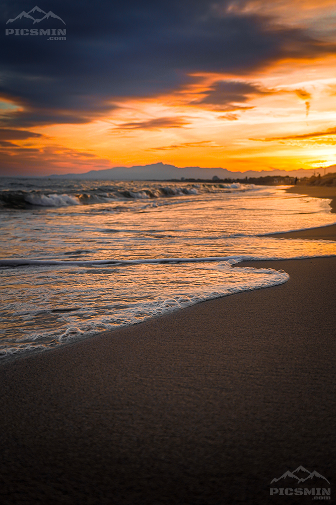 The beach is catching the last light of the day, and the whole scene feels like it’s holding its breath for that final burst of color. The sun is dropping behind the distant mountains, throwing warm orange and gold across the sky like it’s trying to impress someone.